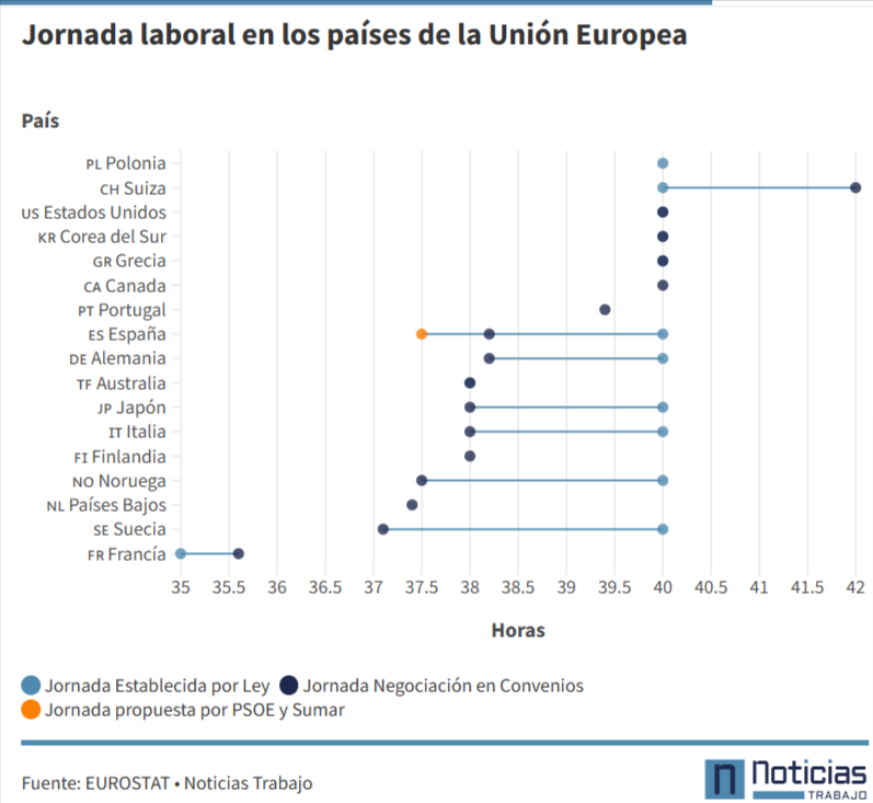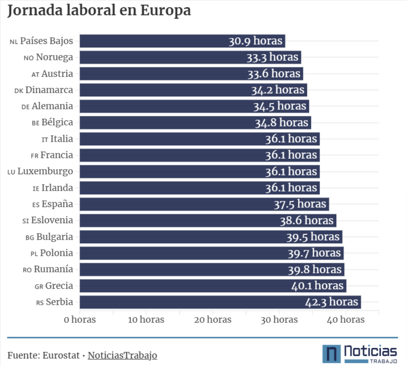 De acuerdo con datos de Eurostat, la mayoría de los países de la Unión Europea tienen una jornada laboral estándar de 40 horas semanales, distribuidas en cinco días laborables y dos de descanso. Aun así, hay que distinguir entre la jornada laboral legal y la jornada laboral promedio, que refleja las horas reales trabajadas semanalmente en cada país. Según cifras del 2022, la media de horas trabajadas en Europa es de 37,5 horas a la semana.