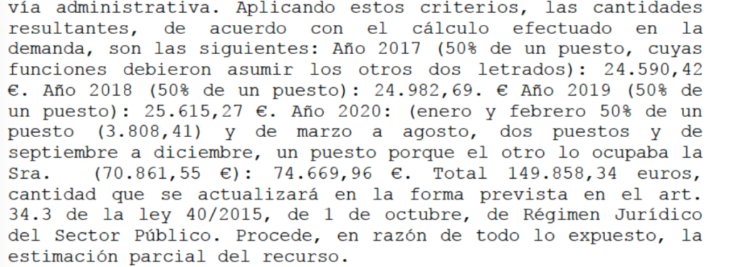 Asume los cálculos de la demanda según las retribuciones de la carga de trabajo suplementaria asumida, cifrándolo en el total de 149.858,34 €, que la sentencia explica: