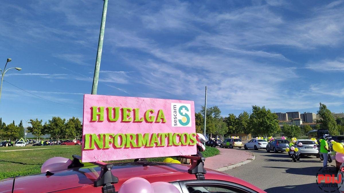 Se cumple un mes de la huelga indefinida de los trabajadores informáticos del Servicio de Salud de Castilla-La Mancha (SESCAM) el mismo día en el que se celebra el Debate sobre el Estado de la Región en las Cortes regionales. Durante la comparecencia del presidente, Emiliano García-Page, para hacer balance de su gestión y avanzar en las líneas de futuro, una caravana de unos cincuenta vehículos han recorrido parte de la ciudad, con parada ante la Consejería de Sanidad, como medida de protesta por tres décadas de "temporalidad" sin soluciones para un colectivo que reclama una moratoria en las oposiciones hasta que la Administración del Estado resuelva la situación, tras la sentencia llegada desde Europa en la que se apuntaba a España como país que abusa de los interinos.