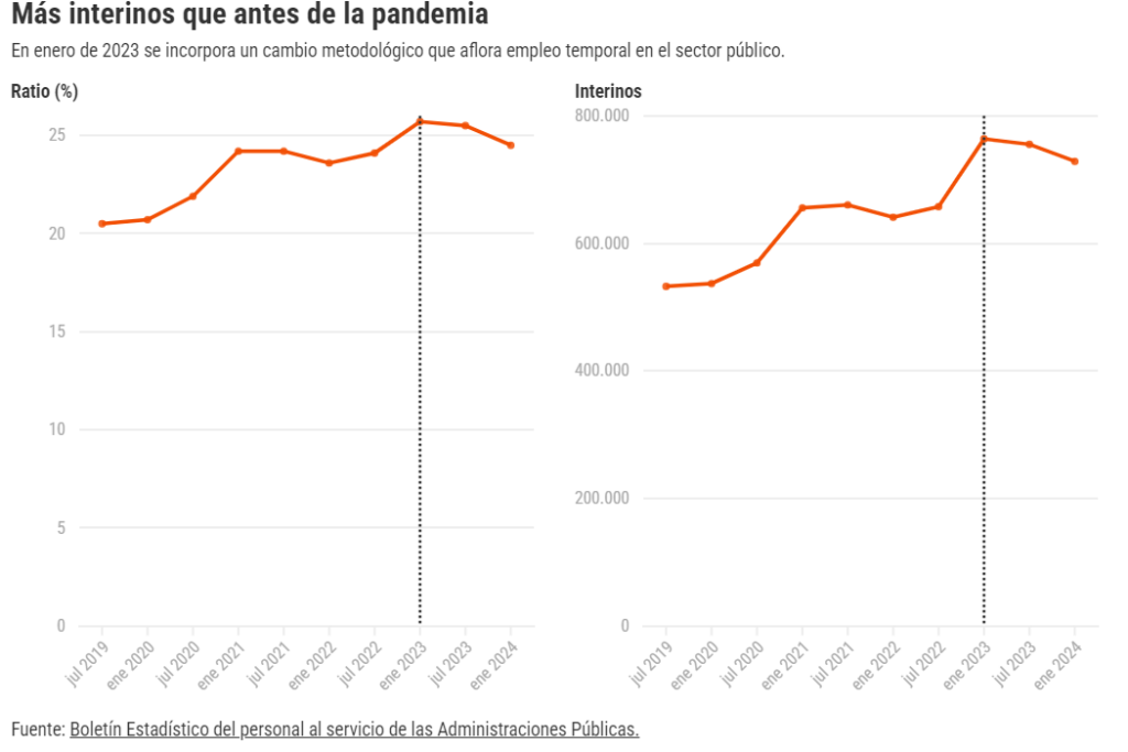 Y así lo confirma también el Ministerio, que explica un cambio metodológico desde enero de 2023 en los datos publicados en el Boletín Estadístico del Personal al servicio de las Administraciones Públicas. Ahora se incorpora información sobre todos los contratos temporales, también los de duración inferior a seis meses, y categorías de personal que no se estaban teniendo en cuenta, como en formación o prácticas. Esto lleva a sumar a miles de empleados públicos, en su mayoría temporales, y permite que las cifras oficiales de empleados públicos recogidas en este boletín se acerquen más a las que da la Encuesta de Población Activa del INE.