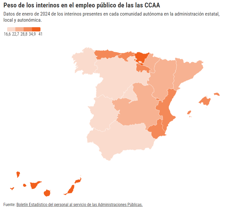 El problema de la elevada temporalidad en el empleo público se concentra en las comunidades autónomas, que tenían una tasa de interinidad del 33,5% en enero de 2024, frente al 15,3% de la administración local y tan solo el 3,1% de la estatal. Se trata de plantillas muy feminizadas (el 72,9% de los interinos son mujeres) y especialmente ubicadas en la sanidad y la educación no universitaria, ya que ambas suman el 74,8% de los interinos totales y son, precisamente, competencias autonómicas.