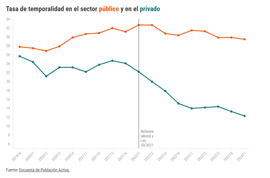 La ley 20/2021 de medidas urgentes para la reducción de la temporalidad en el empleo público surge como uno de los requisitos para recibir fondos asociados al componente 11 del Plan de Recuperación y prometía que la tasa de temporalidad en el empleo público del conjunto de las administraciones se situaría “por debajo del 8% de las plazas estructurales”.