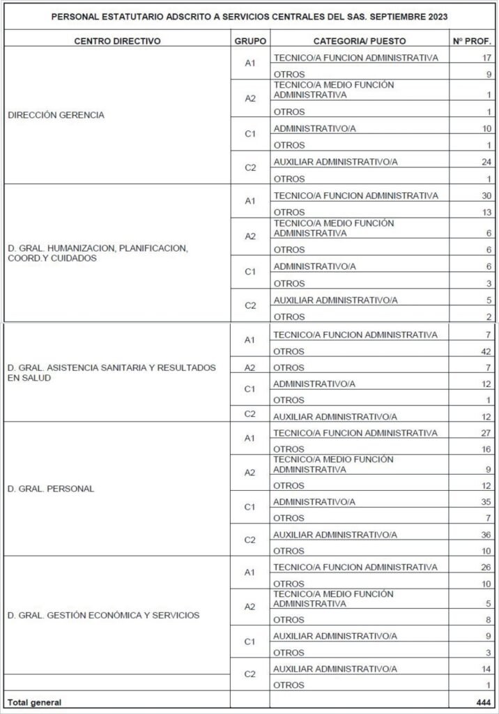 Con relación al personal adscrito ilegalmente en los Servicios Centrales (SSCC) del SAS, estos son los datos oficiales facilitados por la Dirección General de Personal del SAS, Carmen Bustamante, tras dos largos meses de espera desde la presentación de la solicitud (sólo se ha hecho entrega parcial de la información solicitada, porque no se ha indicado el número de los estatutarios que tienen concedida por escrito una comisión de servicio con arreglo al artículo 39 de la Ley 55/2003):