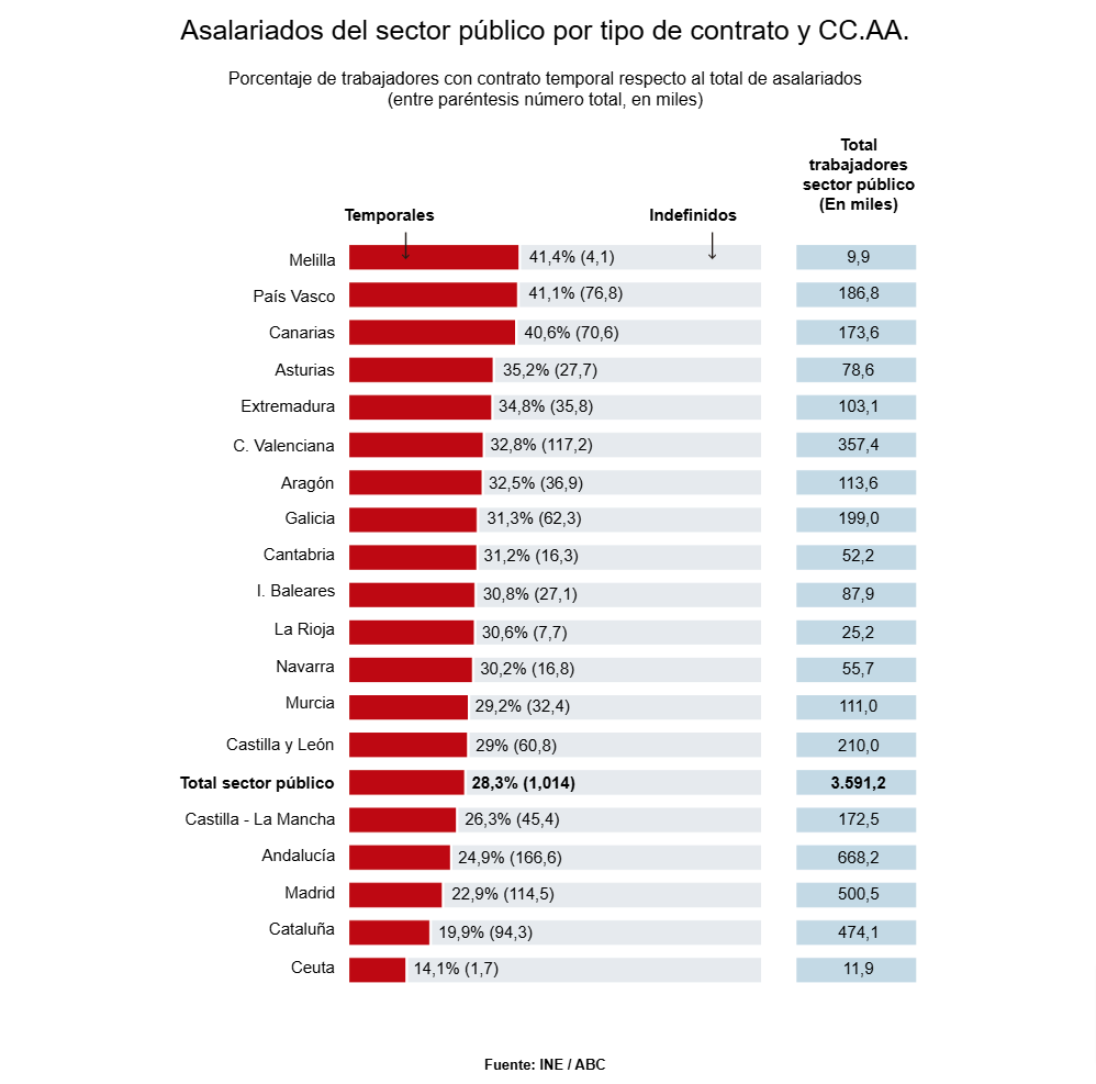De datos de temporalidad en el sector público en las autonomías se desprende que Cataluña, con una tasa del 19,9% es la región con menos temporalidad en España, seguidas de Madrid (22,9%) y de Andalucía (24,9%). País Vasco (41,1%), Canarias (40,6%) y Asturias (35,2%) son, por el contrario, las regiones que registran más eventualidad.