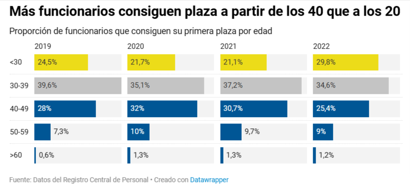 Según los datos del Registro Central de Personal, entre el 2019 y el 2022, los últimos disponibles, el grueso de los funcionarios y laborales fijos del Estado de nuevo ingreso en la administración general tenían entre 30 y 40 años. El porcentaje muestra el momento del ingreso, pero no cuándo se empezó a estudiar la oposición, un periodo que puede alargarse varios años, según la categoría, ni cuándo se realiza el examen, hasta dos años antes de acceder de facto al puesto, por lo que posibles cambios en los patrones pueden tardar en apreciarse.