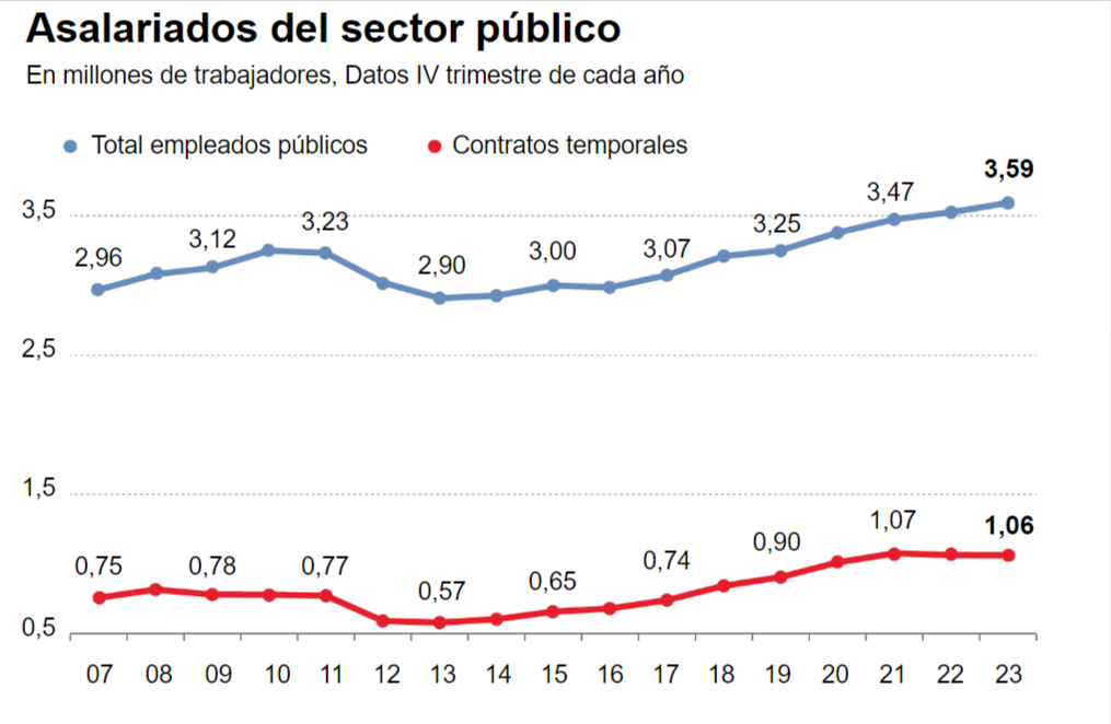 El sector público ha engordado su plantilla en cinco años con 285.800 eventuales y la cifra total roza ya los 1,1 millones