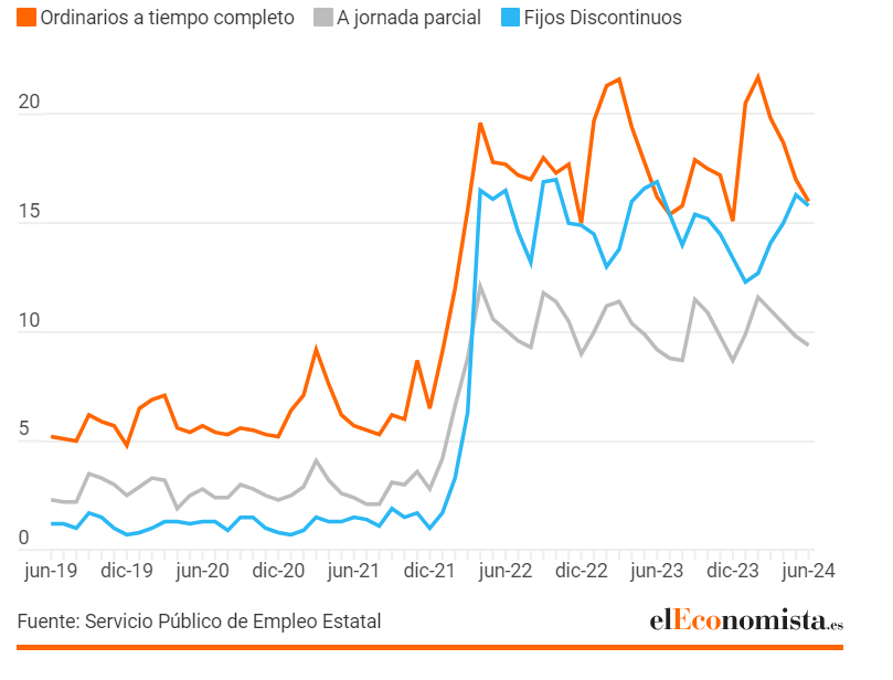 Los sospechosos principales son los contratos fijos discontinuos. Una categoría que las estadísticas del SEPE siempre han separado de los indefinidos a jornada completa (aunque uno de estos trabajadores pueda, por ejemplo, hacer 8 horas de trabajo diarias) por su inestabilidad.