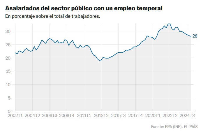 La elevada temporalidad en el sector público sigue sin corregirse, pese a los distintos procesos de estabilización que se han iniciado en los últimos años. Los resultados de la Encuesta de Población Activa (EPA) del INE para el primer trimestre del año muestran un ligero retroceso de esta tasa, que se redujo en dos décimas respecto a la anterior muestra (28%), hasta situarse por primera vez por debajo del 30%. Un volumen que, sin embargo, continúa más que duplicando al del sector privado (12,1%).