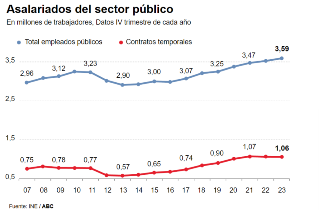 El sector público ha engordado su plantilla en cinco años con 285.800 eventuales y la cifra total roza ya los 1,1 millones