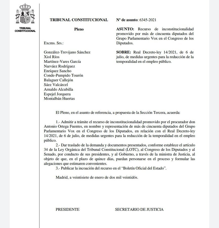 Ha sido admitido por el Tribunal Constitucional, el recurso presentado por el grupo VOX, sobre el RD 14/21 de 6 de julio de medidas urgentes para la reducción de la temporalidad en el empleo público