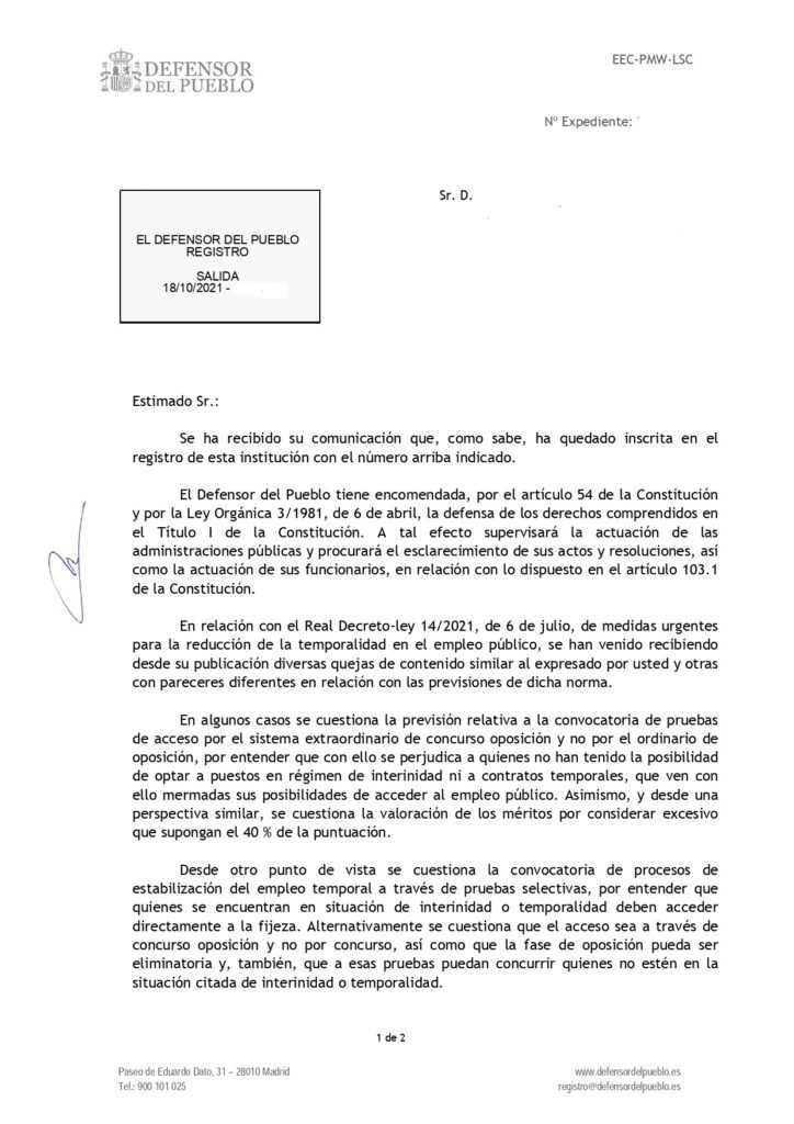 He recibido una carta del Defensor del Pueblo, y esta es su contestación.