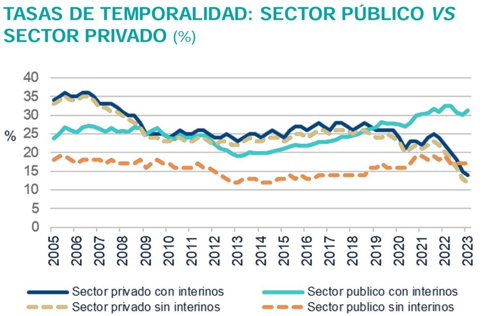 Miren el segundo gráfico: con aquellos temporales que llevan más de tres años en esa situación. Algo de nuevo excepcional en el sector privado pero que ya es mayoritario en el público.