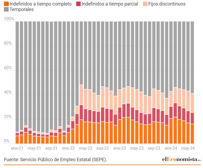 Aunque estos porcentajes fluctúan enormemente según el mes del año, lo que se aprecia es un estancamiento del peso de los contratos. Así, los datos registrados a lo largo de 2024 son idénticos a los anotados en los seis primeros meses del pasado año. Lo que explica que la suma de contratos indefinidos siga suponiendo cuatro de cada diez de los que se firman. Aunque cada vez se firmen menos.