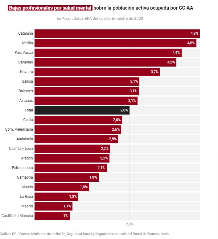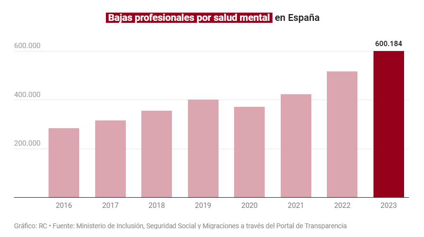 Las bajas tramitadas por el Instituto Nacional de la Seguridad Social se han duplicado en los últimos siete años al pasar de las 283.913 registradas en 2017 a las 600.814 en 2023. Un aumento que se ha visto impulsado por el número de incapacidades temporales firmadas en Canarias, Melilla y Aragón, las tres regiones dónde más crece el número de bajas laborales relacionadas con trastornos mentales y de comportamiento. «Como sociedad somos más conscientes de la importancia de la salud mental», explica Isabel Aranda, doctora en Psicología organizacional y vocal del Colegio Oficial de la Psicología de Madrid.