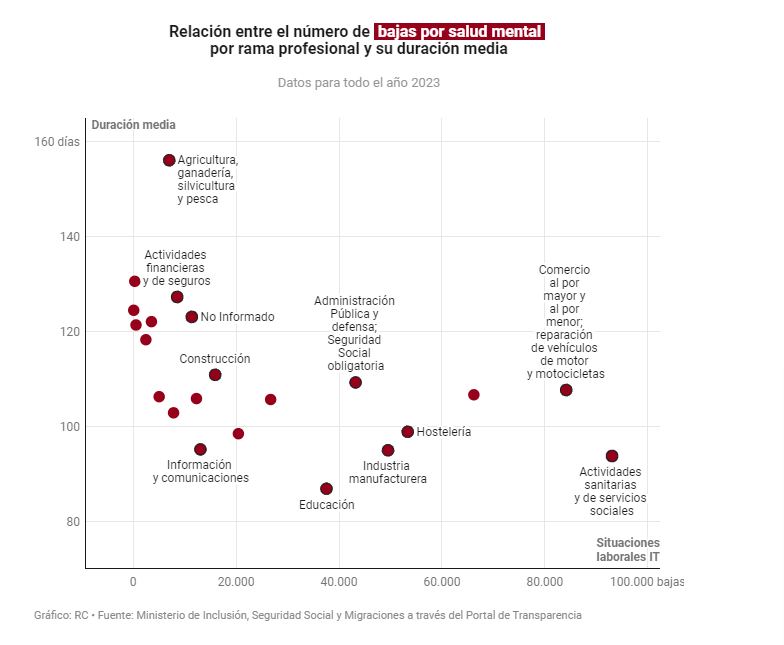 La duración media de estas incapacidades temporales en 2023 fue de 111 días, más de tres meses y medio. Aunque en algunas ramas profesionales, el tiempo de baja se dispara hasta los 156 días como es el caso de la agricultura, ganadería, silvicultura y pesca.