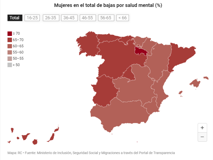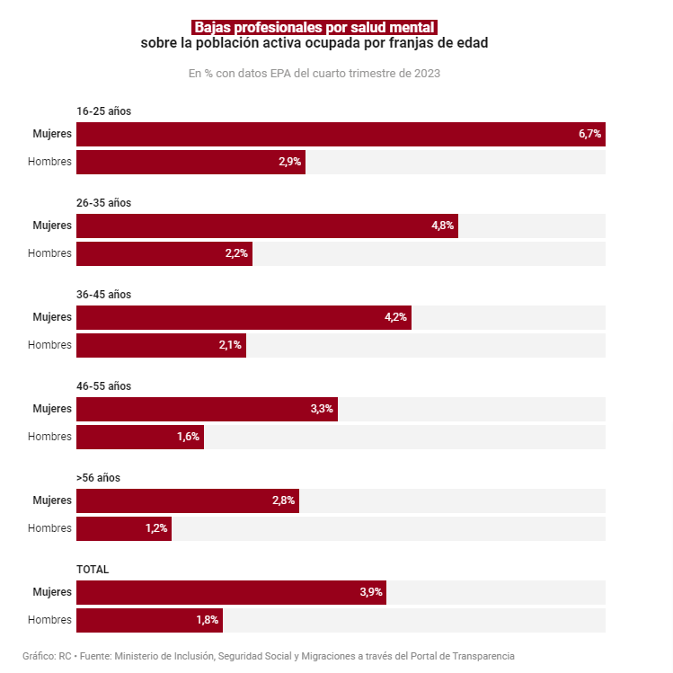 La cifra se dispara al rastrear la cifra de mujeres trabajadoras entre los 16 y 25 años, en esta franja se conceden 66 bajas médicas relacionadas con la salud mental por cada mil ocupadas en estos años.