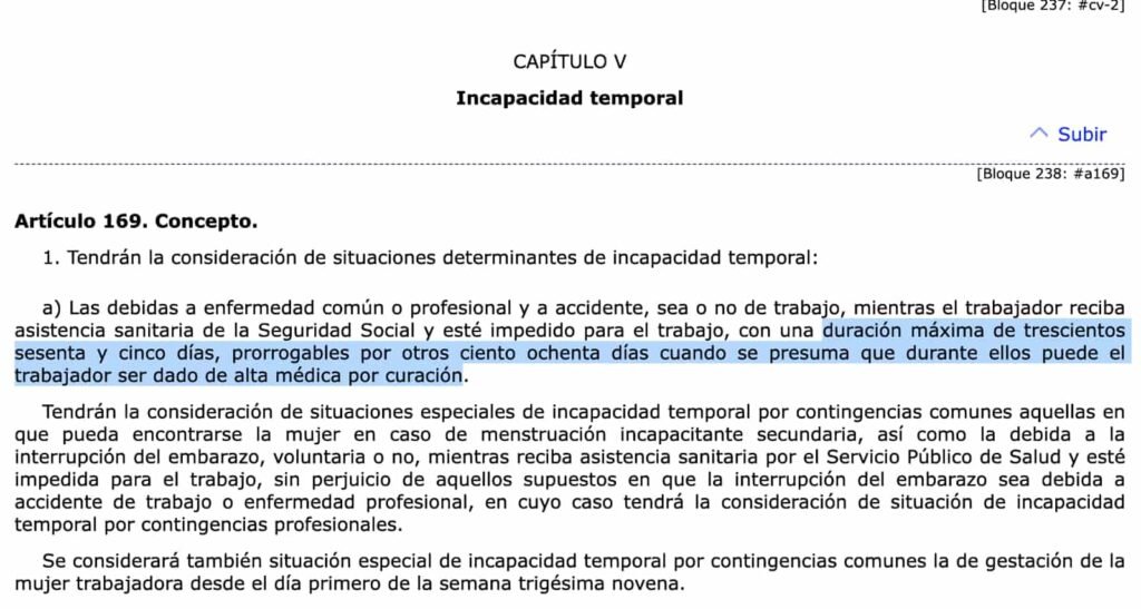 Así, lo recoge el artículo 169 del Capitulo V de la Ley General de la Seguridad Social. Este artículo explica estos supuestos y cuál es la duración máxima en el caso de estar bajo una incapacidad temporal.