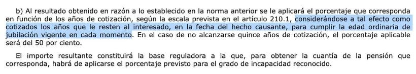 Además, el mismo artículo añade que, si con esta suma de años reales y ficticios no se alcanzan los 15 años de cotización, el porcentaje aplicable será del 50%. En otras palabras, la ley crea un escenario hipotético en el que el trabajador hubiera seguido cotizando hasta su edad de retiro para que su pensión sea lo más completa posible.