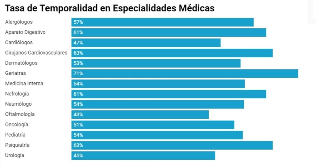 Si usted necesita un médico especialista en la comunidad de Madrid, sepa que seguramente el facultativo que le está atendiendo al otro lado de la mesa no tenga la plaza en propiedad. Es decir, será interino o eventual. Aquí van unos ejemplos: 36 de los 57 cirujanos cardiovasculares que trabajan en los hospitales de la región son temporales. Igual pasa con 76 de los 133 alergólogos, con 245 de los 402 digestivos, con 170 de los 364 cardiólogos, con 108 de los 204 dermatólogos, con 147 de los 206 geriatras, con 130 de los 241 nefrólogos, con 169 de los 390 oftalmólogos, con 98 de los 196 oncólogos, con 410 de los 650 psiquiatras… la lista es larga. Tanto, que la tasa de temporalidad media es del 54,83%, muy superior al objetivo del 8% fijado por la Unión Europea. Además, el 14% de los profesionales temporales tienen más de 60 años.